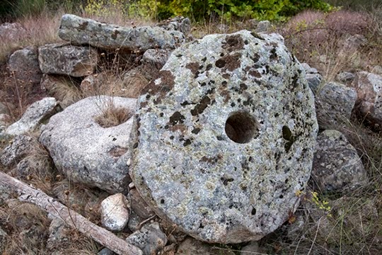 [Linha do Tua 31] A linha continua num cenário muito acidentado, de curvas e contracurvas, e o rio segue o seu curso no fundo do vale alcantilado, com raras zonas de espraiamento. Ainda que a linha siga a uma cota apenas 20 ou 30 metros acima do nível da água, é difícil o acesso às margens do rio, dada a pendente elevada e o terreno de geomorfologia muito irregular. Os marcos quilométricos marcam a passagem da distância, numa viagem lenta. Ao passar o quilómetro 17, acontece um dos raros depósitos de aluvião deste troço inicial do rio. Na margem esquerda, numa pequena praia pedregosa encontramos alguns vestígios de povoamento. Mós muito erodidas pela força das águas e de sucessivas cheias indicam-nos que ali existiram moinhos de água, embora já quase não sejam visíveis vestígios dessas construções.